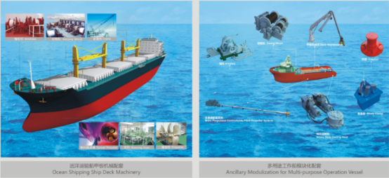 可為各種遠洋運輸船、三用工作船(AHTS)、平臺供應船(PSV)提供甲板系統(tǒng)集成配套解決方案,主要包括拖纜機、鯊魚鉗、機械手、絞盤、錨機等設備。